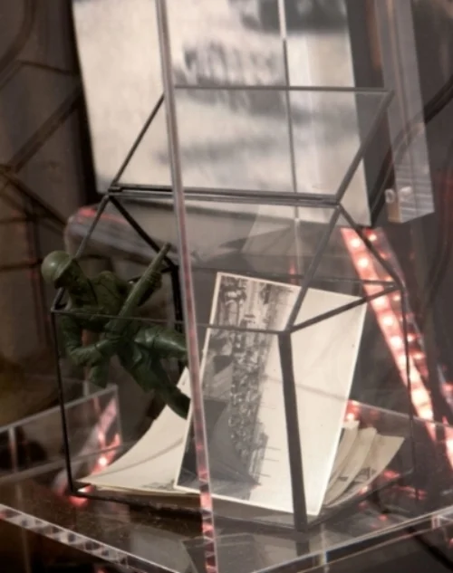 Archival and altered photographs, audio authored micro-story, army blanket, toy artifacts, bullet casings, plexiglass forms, photographic rug, ship chairs, text, vitrine,